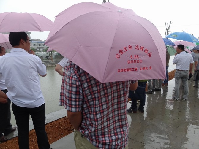 在6.26国际禁毒日即将来临之际,结合党的群众路线教育方针,18日上午,乐清市翁垟街道禁毒办、乐清·霍邱党员禁毒志愿者开展禁毒宣传活动与街道在门前村进行的“五水共治”调研活动相结合。此次宣传活动向街道工作人员与围观市民发放“珍爱生命 远离毒品”禁毒宣传雨伞,共计200份。