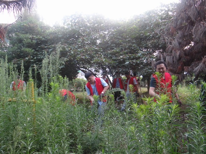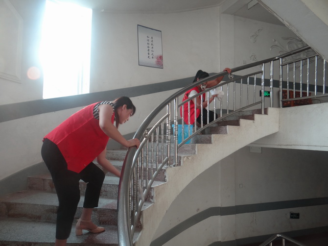 首先同志们齐心协力、解决了院内一大块废弃的健身场所里的杂草,又清理了花坛里散落着的塑料袋、纸屑、烂砖等垃圾后。志愿者们又毫不犹豫的拿起工具开始打扫男志愿者们仔细的清扫院内外的尘土,用铁锹去除围墙周围的杂草,清扫院落以及墙角草丛中的垃圾,扫帚扫不净的顽固垃圾,就拿手一点点把它们取出来。女志愿者认真的擦拭着楼梯扶手、桌子、窗户的室内环境。经过三个多小时的不屑努力,老年公寓内的环境焕然一新,志愿者和公寓内的老人们都欣慰地笑着。