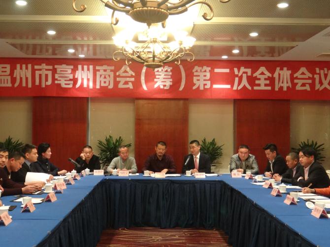 为增强在温州市亳州籍企业家和工商业者的凝聚力,促进在温州亳州籍徽商的发展,增进温州、亳州两地文化经济交流,由浙江店里店外餐饮管理有限公司董事长周大磊、古井集团驻温州总代理马传文、温州市法罗娜洁具有限公司董事长李建民发起的温州市亳州商会第二次筹备工作会议于2016年12月17日在温州市华侨饭店隆重召开。会议特别邀请了安徽省霍邱县驻乐清市流动人口党委书记、工作站站长陈孝明作为嘉宾出席。