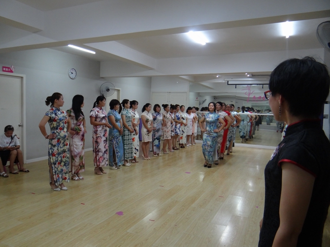 旗袍队学员们自行分成两列,在音乐伴奏下跟着老师的步伐摆起各种亮相、转头、走台的造型。学的不亦乐乎。