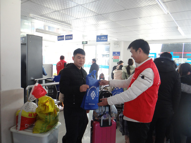 协会志愿者们到车站候车室发放宣传资料及宣传品。
