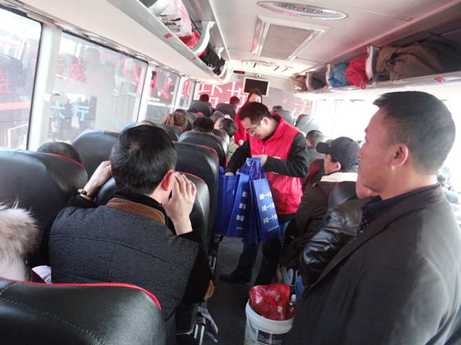 协会志愿者在车上向安徽籍流动人口发放交通安全宣传资料,倡导他们自觉抵制交通违法行为,提高自身的安全意识,避免交通事 故的发生,确保安全文明出行。