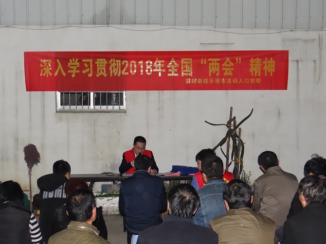 为让安徽籍在乐流动人口进一步了解2018年全国“两会”精神,2018年3月25日晚,霍邱县驻乐清市流动人口党委在柳市镇深河村深入开展学习贯彻2018年全国“两会”精神宣传活动。活动主要以户外集中学习和入户一对一宣传为主。