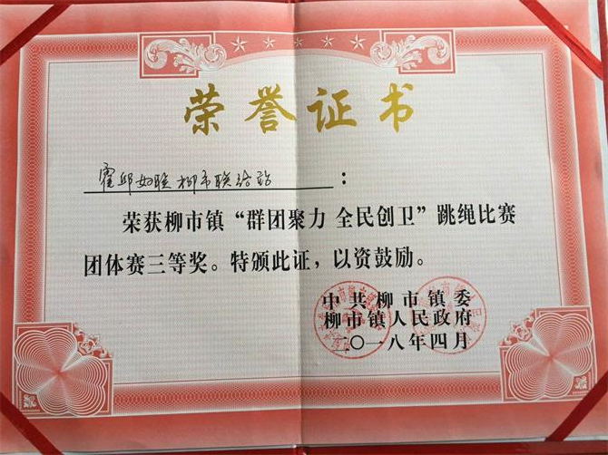为增强柳市镇创建卫生镇的责任感和使命感,让卫生理念渗透我们生活的方方面面,让他们自觉接受社会公德、文明生活方式和健康生活常识教育,主动参与绿化美化活动,2018年4月28日下午,柳市镇工会、团委、妇联、社会管理分局联合举办柳市镇“群团聚力 全民创卫”跳绳比赛。霍邱妇联驻柳市联络站作为乐清新居民代表队参加跳绳团体赛。并通过不懈努力荣获三等奖。