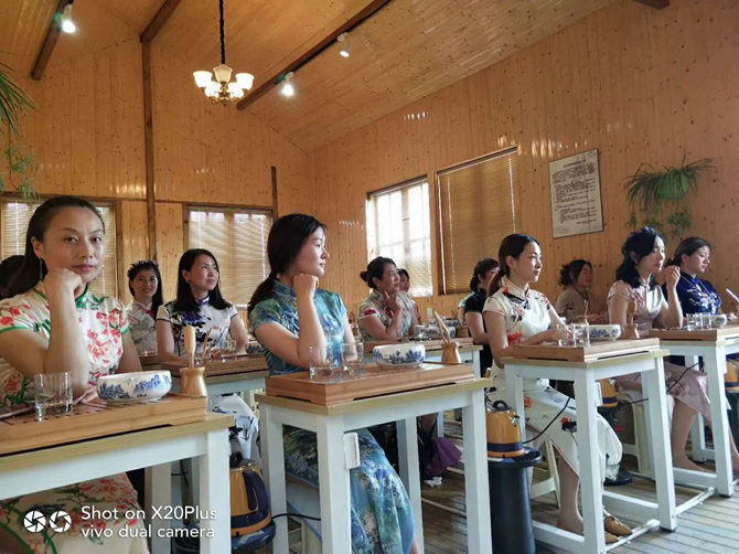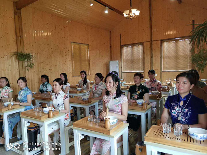 旗袍队员走秀后,紧接着开始接受茶道学习,茶道老师以茶叶历史开始,从茶叶生长、采摘、制作、冲泡知识、茶艺方法等方面,深入浅出地讲解了博大精深的茶文化、茶道养生等知识。