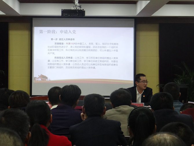 党委副书记贾红印带领全体党员、预备党员、积极分子学习发展党员工作流程。