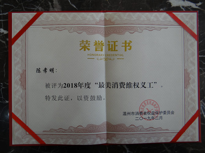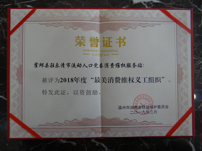 霍邱县驻乐清市流动人口党委消费维权服务站被温州市消费者权益保护委员会评为2018年度“最美消费维权义工组织”、霍邱县驻乐清市流动人口党委书记陈孝明被评为2018年度“最美消费维权义工”。