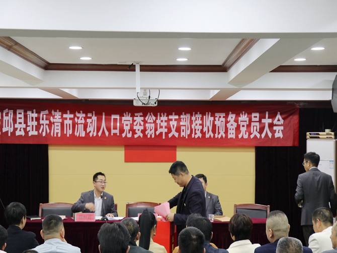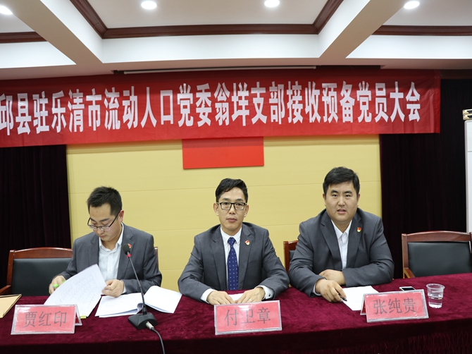 2019年12月12日晚,霍邱县驻乐清市流动人口党委翁垟支部召开接收预备党员大会。党委副书记贾红印,党委组织委员、柳市支部书记张纯贵,党委纪委委员、翁垟支部书记付卫章参加会议。会议由贾红印主持。