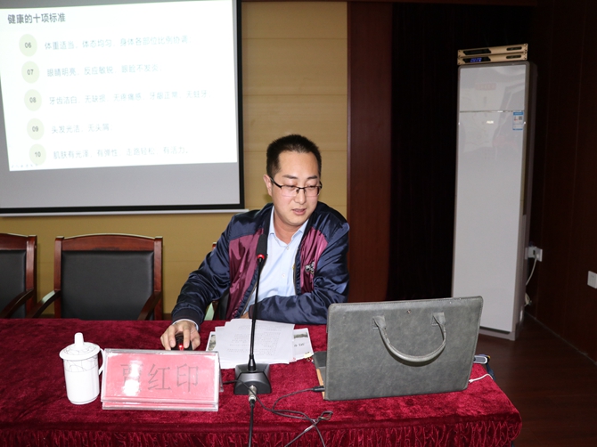 讲座中,健康营养师贾红印以PPT的形式,从健康的十项标准、男性常见疾病、男性该如何养生、亚健康的表现后果及如何预防保健等方面,向大家讲解了有关男性健康的知识,引导大家既要关心男性的身体健康,又要关心男性的生理、心理健康和社会承受能力。并提醒男同胞们关注自己的生活,关爱自己的健康,加强日常生活自我保健,重视健康生活,远离疾病。