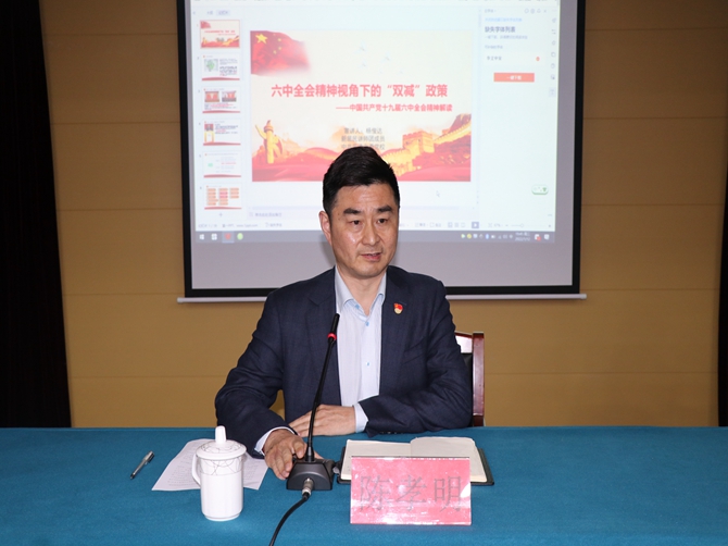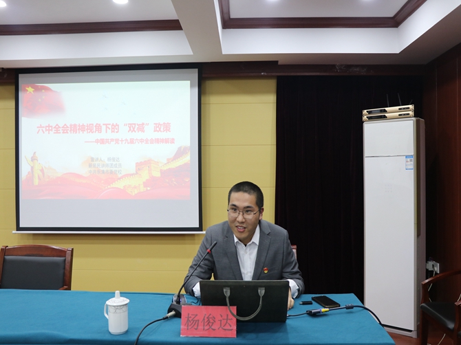 杨俊达通过PPT的方式首先回顾剖析了什么是六中全会精神,再从全会精神的视角下解释了什么是“双减”政策,讲解了“双减”政策出台的社会背景,并从文化建设、社会建设等方面明确教育的任务是立德树人,培养德智体美劳全面发展的社会主义建设者和接班人。