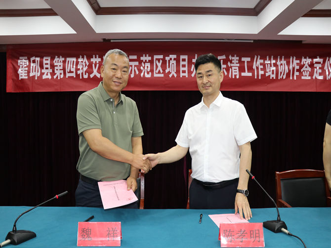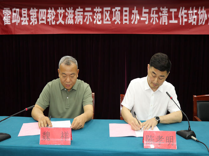 魏祥与陈孝明在三楼会议室签订《霍邱县第四轮艾滋病综合防治合作框架协议》。
