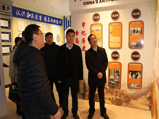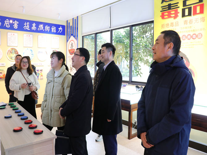 苏云龙一行在基地负责人陈孝明的陪同下,先后参观了户外宣传栏、综合服务大厅、智慧党建平台、禁毒驿站、禁毒基地等各职能办公室,并浏览了毒品仿真品、月刊月报、禁毒工作台账等相关资料,随后在一楼召开座谈会。