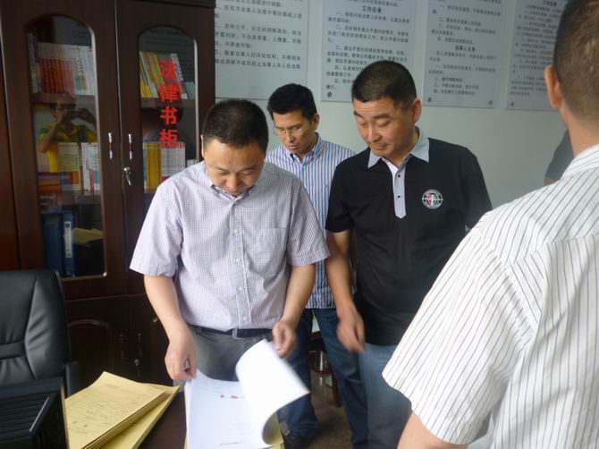2012年6月6日,乐清市政法委黄副书记和体育局刘副局长在翁垟街道党委副书记陈祥浩的陪同下,到霍邱县驻乐清市党支部视察工作。黄副书记首先参观了陈孝明调解工作室,后又调阅了党支部2012年上半年以来已调解好的案件,并且对我们党支部的工作给予了很高的评价,及提出了很宝贵的建议。黄副书记还特别指出,乐清市委.翁垟街道办事处会根据党支部的实际困难,给予相应的帮助。随后,黄副书记又参观了党支部会议室。对党支部会议室非常满意,认为我们会议室的规划和布置也非常规范。