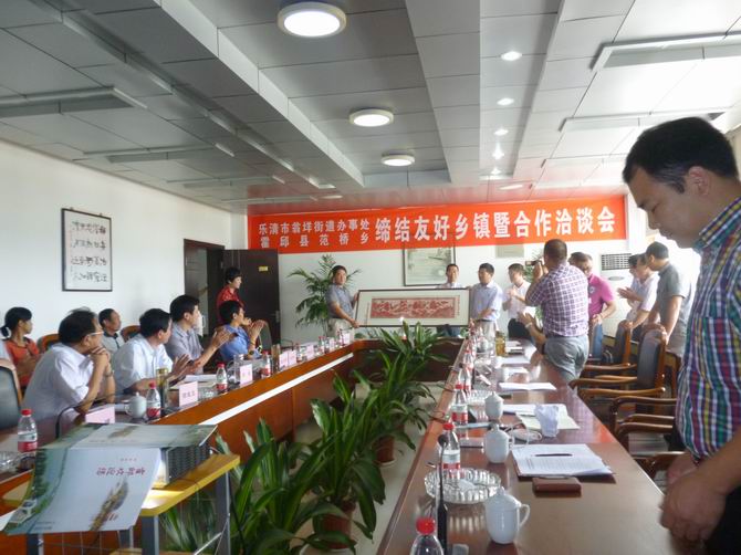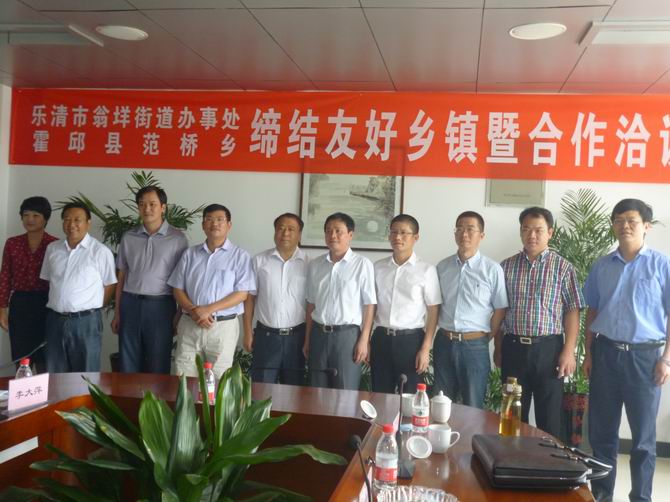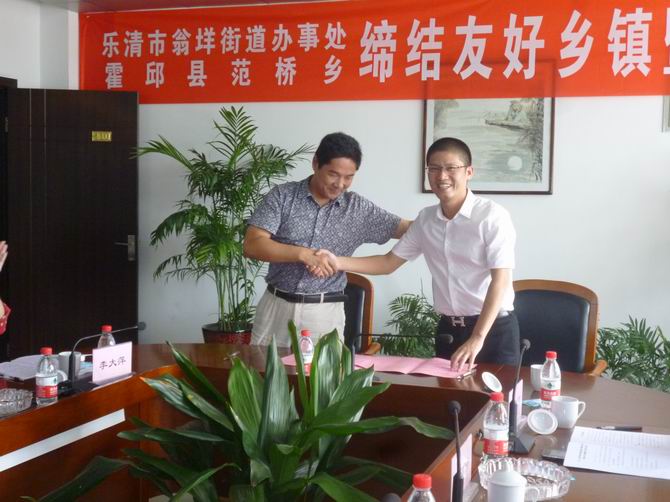 霍邱县驻乐清市流动人口党支部积极主动为乐清、霍邱两市县搭建友好平台,2012年9月3日上午,霍邱县范桥乡与乐清市翁垟街道办事处缔结友好乡镇暨合作洽谈会在霍邱县范桥乡金安矿区四楼会议室召开,双方签署了《乐清市翁垟街道办事处霍邱县范桥乡人民政府关于缔结友好乡镇协议书》,相互交换了礼物并合影留念。会议由县委组织部副部长张烈鹏主持。洽谈会上,会上人员首先观看了霍邱县情、金安矿业有限公司发展专题片。霍邱县范桥乡党委书记傅长发首先在仪式上做了重要讲话。他首先代表霍邱县范桥乡对乐清市翁垟街道办事处党政企考察团一行莅临范桥乡考察指导工作表示诚挚的欢迎!傅书记向会上人员介绍了范桥乡的基本概况。傅书记说,范桥乡位于霍邱西部,全乡辖11个村委会,106个村民组,人口有5万人,区域面积80平方公里。近年来积极推进区域经济快速发展,跻身经济总量全县前五、财政收入前十的行列。获得经济运行良好乡镇,招商引资先进乡镇,教育工作先进乡镇、社会治安综合治理、信访稳定、人口计划生育、新农村建设工作先进乡镇等荣誉称号。霍邱的矿产资源量也极为丰富,铁矿储存量25亿吨,远景储量35亿吨,位居全国第五、华东第一。范桥乡铁矿储量占全县的三分之一,是全县铁矿开发的主战场。目前已有“五矿”、“南钢集团”内蒙古“大中集团等国企、民企7家铁矿企业入驻范桥。傅书记紧接着又介绍了范桥乡的城镇规化。提升老区,投资1500多万改造范桥乡老街三横二纵道路。实现了硬化、亮华、绿化、净化、美化;拓展新区,东部新建新农村示范点——顺和家园,占地300亩,建筑面积28万平方米,可入驻2040户,项目正在建设中。西部开发“三区一园”,分别是商贸新区、政务新区、矿区搬迁安置区和工业园。工业园规划占地1.2平方公里,重点安置招商引资项目。“让一切投资者赚钱,让一切创业者成功”,范桥乡党委、政府将一如既往加强基层党组织,畅通投资渠道、优化发展环境,致力打造“成本洼池、服务高地”的创业平台。追求“服务零缺陷,满意在范桥”服务意识,范桥乡以崭新的姿态欢迎有识之士前来加盟。乐清市翁垟街道办事处主任朱小恭对翁垟街道的基本概况也做了重要的介绍。霍邱县副县长吴昊在签约仪式上也发表了热情洋溢的讲话。他说,霍邱县是人口大县、占地面积大、有丰富的人力资源、农产品资源、和铁矿资源,有很大的发掘潜力。霍邱的工业经济也得到了快速的发展,农副产品深加工、铁矿开发、柳编业、饮品化工、等多种工业经济也得到了快速的发展。范桥乡是集水陆交通便捷、矿产资源丰富、城镇初具规模的乡镇。并且有一个非常强的领导班子,发展潜力很大,希望通过缔结友好合作能够把范桥乡打造成新农村建设示范点和弘扬企业文化的乡镇。