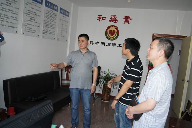 2012年9月11日,乐清市司法局基层科科长潘伟等领导在翁垟街道办事处司法所所长徐洁伟的陪同下莅临霍邱县驻乐清市党支部参观指导工作。首先, 潘科长参观了党支部民工维权办公室,查阅了2012年以来党支部民工维权办公室成功调解所有案件的卷宗,并且对案卷里面的不足之处做了进一步的指导。接着又来到了党支部会议室,参观了霍邱县驻乐清市流动人口党员组织网络图和乐清市·霍邱县流动人口计划生育协会组织网络图。对我们支部会议室的布局也给了很高的评价。潘科长说:“会议室布置的很有独特性,融入了自己的特色”。最后潘科长来到了书记办公室,党支部书记陈孝明向潘科长详细汇报了支部人员配置和日常工作开展的有关情况。听过汇报后,潘科长对我们支部日常所做的工作给予了很大的肯定。特别是司法方面“以外调外”的模式做的非常好。从根本上解决了外来务工人员民事纠纷的矛盾。也给农民工提供了有力的法律保障。
