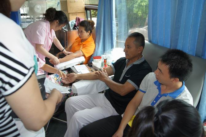 2012年9月14日上午,霍邱县驻乐清市党支部成员、流动党员、计划生育协会会员及霍邱籍老乡在党支部书记陈孝明的带领下到乐清市翁垟街道办事处参加无偿献血活动。通过霍邱县驻乐清市党支部的全面安排和精心组织。这次参加无偿献血活动的总人数有112名,其中党员志愿者35名,计划生育协会理事及会员40名,霍邱籍群众37名。到达后他们认真填写采血登记表,详细了解献血知识,在医务人员进行血型、血压、心率等常规检查化验后,有序的走上献血车和献血台,开始献血。在霍邱籍老乡里面大部分都是第一次献血,但丝毫没有感觉到他们的紧张。其中还有一位叫张文军的献血者,霍邱县范桥乡刘庙村文书,一名党员,前几天到乐清出差,刚好遇到我们组织无偿献血活动,他知道后,毫不犹豫的也参加了我们这次无偿献血的活动。