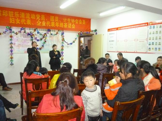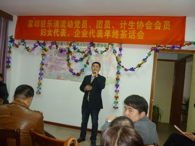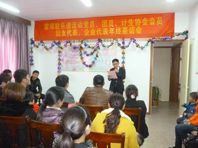 2013年1月29日,霍邱驻乐清市流动党员、团员、计生协会会员、妇女代表、企业代表年终茶话会在霍邱县驻乐清市流动人口党支部会议室举行。茶话会由乐清·霍邱计划生育协会秘书长付卫章主持。茶话会上党支部书记陈孝明首先向霍邱籍老乡致词并致以诚挚的祝福。陈书记说:“很高兴能够在这个美好的日子里与大家相聚在一起。值此新春佳节即将到来之际,我们欢聚一堂,共忆旧岁,喜迎新春,刚刚过去的2012年,极不平凡、极不寻常。这一年,党支部在霍邱县与乐清市两市县的共同领导下,团结一心、共克时艰,做到了大事办成、要事办好、急事办妥。霍邱县驻乐清市流动人口党支部取得的成绩,这与在座的各位老乡的共同参与和大力支持是分不开的。我仅代表霍邱县驻乐清市流动人口党支部向你们致以诚挚的问候和美好的祝愿”!