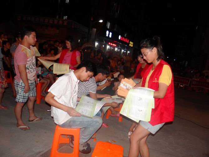 为了进一步做好安徽籍流动人口健康教育宣传工作,提高流动人口的服务和管理水平,2014年8月6日晚7点,安徽省流动人口服务管理乐清市工作站在乐清市翁垟街道翁盐村开展户外文化教育宣传活动。 在工作站志愿者的精心策划下,活动首先以现场观众自主“演唱会”的形式开展。他们唱着自己喜爱的歌曲所洋溢出来的热情,几乎盖过这夏日的炎热。活动现场还设立了免费解暑凉茶点,也给这个炎热的夜晚送去丝丝凉意。一些安徽籍老乡,听说是我们安徽工作站在此开展的宣传活动,都纷纷过来参与。看着他们真诚开心的表情,志愿者也舒心的笑了。活动期间,志愿者深入群众当中,向他们发放计生、司法、消费维权、禁毒等有关法律法规宣传品和宣传材料,并向他们详细讲解一些法律法规的知识。不仅如此,工作站志愿者还和老乡聊起了家常,了解他们在乐清工作和生活的基本状况。工作站站长陈孝明说:“这次宣传只是我们宣传的第一站,我们工作站将在乐清市各个镇街道持续开展这样的宣传活动。能够通过自己的努力,帮助远离家乡在外工作的安徽籍老乡多了解一些法律常识,使他们的生活更加美好,我们很开心”。 活动最终以播放爱国教育片《南京!南京!》拉下帷幕。教育我们不忘国耻,珍惜现在来之不易的生活,呼吁人们以史为鉴、珍爱和平。